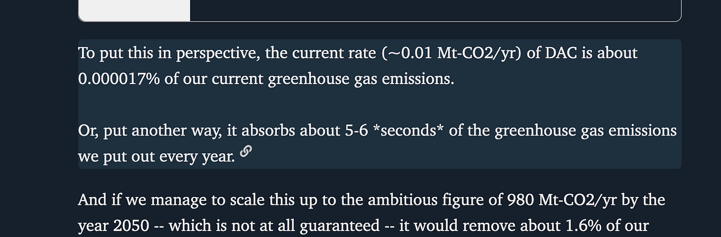 First, incremental progress towards a massive public target is slow, and seems ridiculous. And, particularly vulnerable to ridicule. Do you remember the “number of seconds of emissions” thing? Jon Foley took down his Twitter profile, but the essential criticism of CDR generally (and DAC specifically) was “it’s not big enough to matter.”