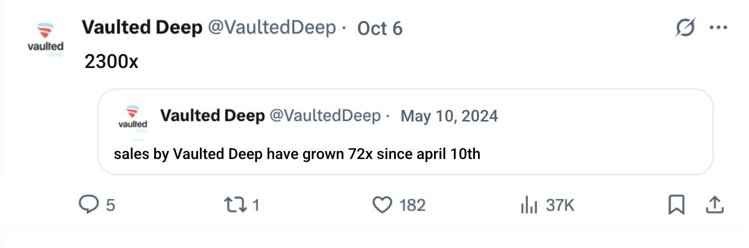 Indulge me: Let’s put on our hype-glasses for a moment and surf on over to the twitter profile of a real company, Vaulted Deep. I’m going to Evan-post on their behalf for a moment, using publicly available data. To be very clear: I am inventing this post. But I think it’s helpful to see what it feels like — reading some good news.